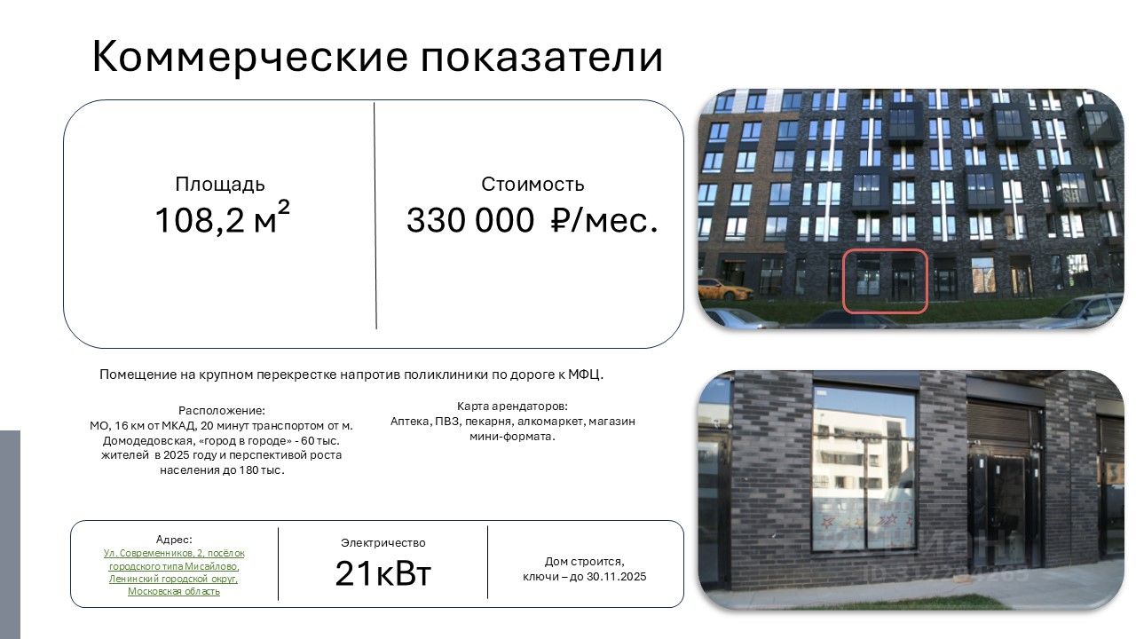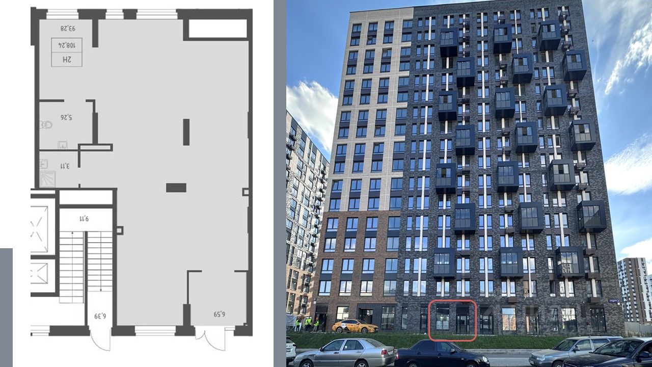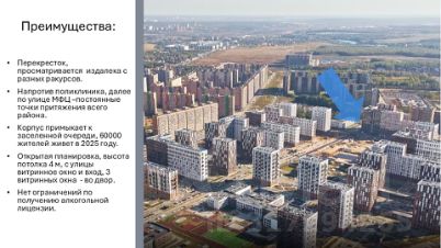 Помещение на перекрестке напротив поликлиники, далее по улице - МФЦ, просматривается издалека, в доме 939 квартир. Корпус примыкает к сданной очереди, стык готовых и строящихся домов. Все квартиры в проекте с чистовой отделкой, и торговые точки востребованы немедленно после выдачи ключей, люди обустраиваются быстро.