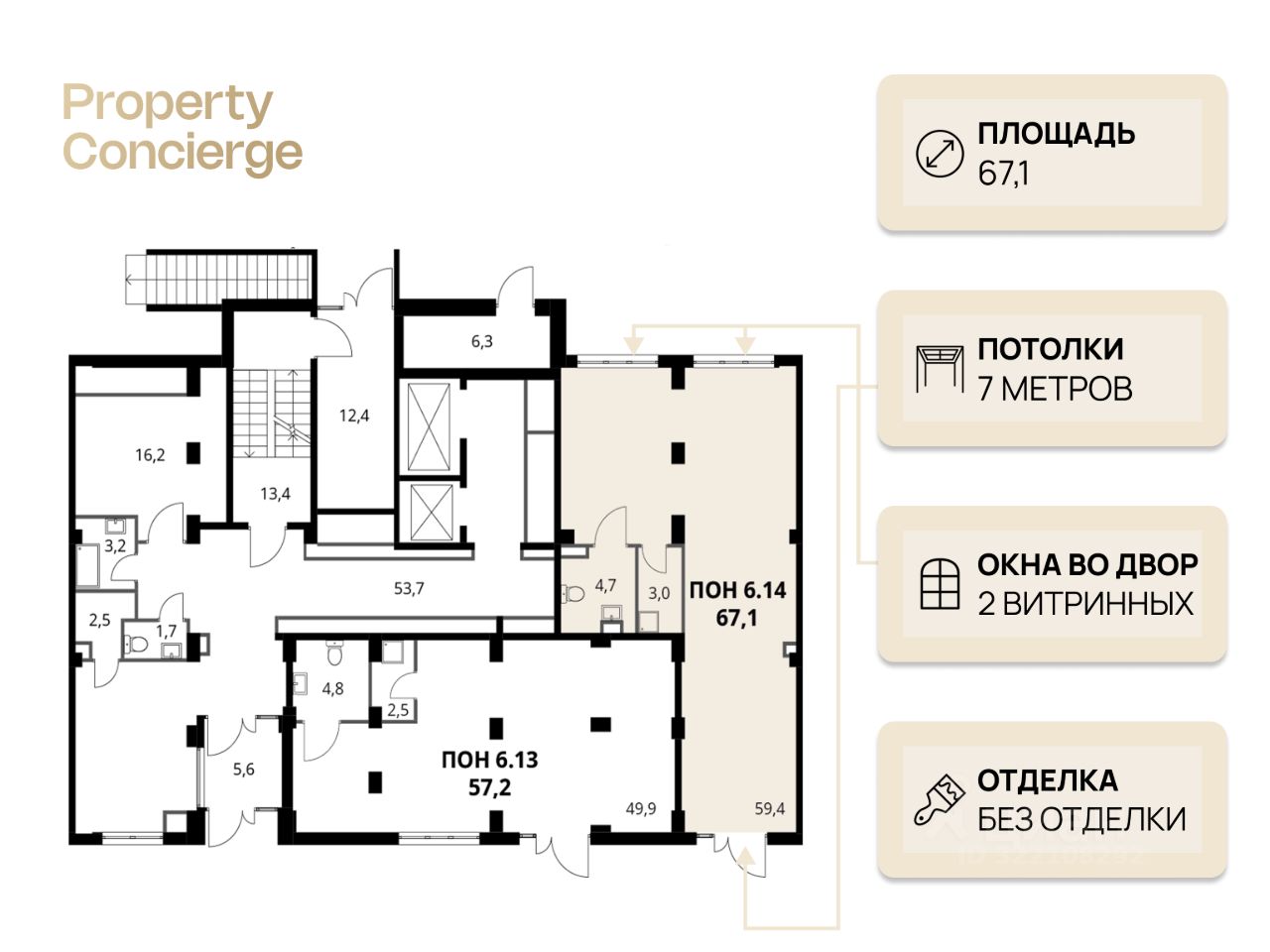 - Планировка 67,1 м²: торговый зал ~59,4 м², С/У 4,7 м², техзона 3 м²