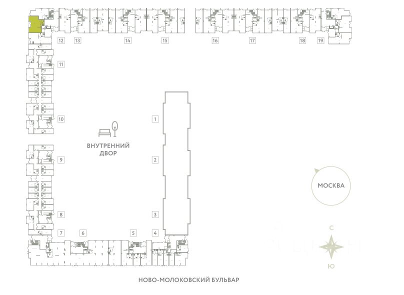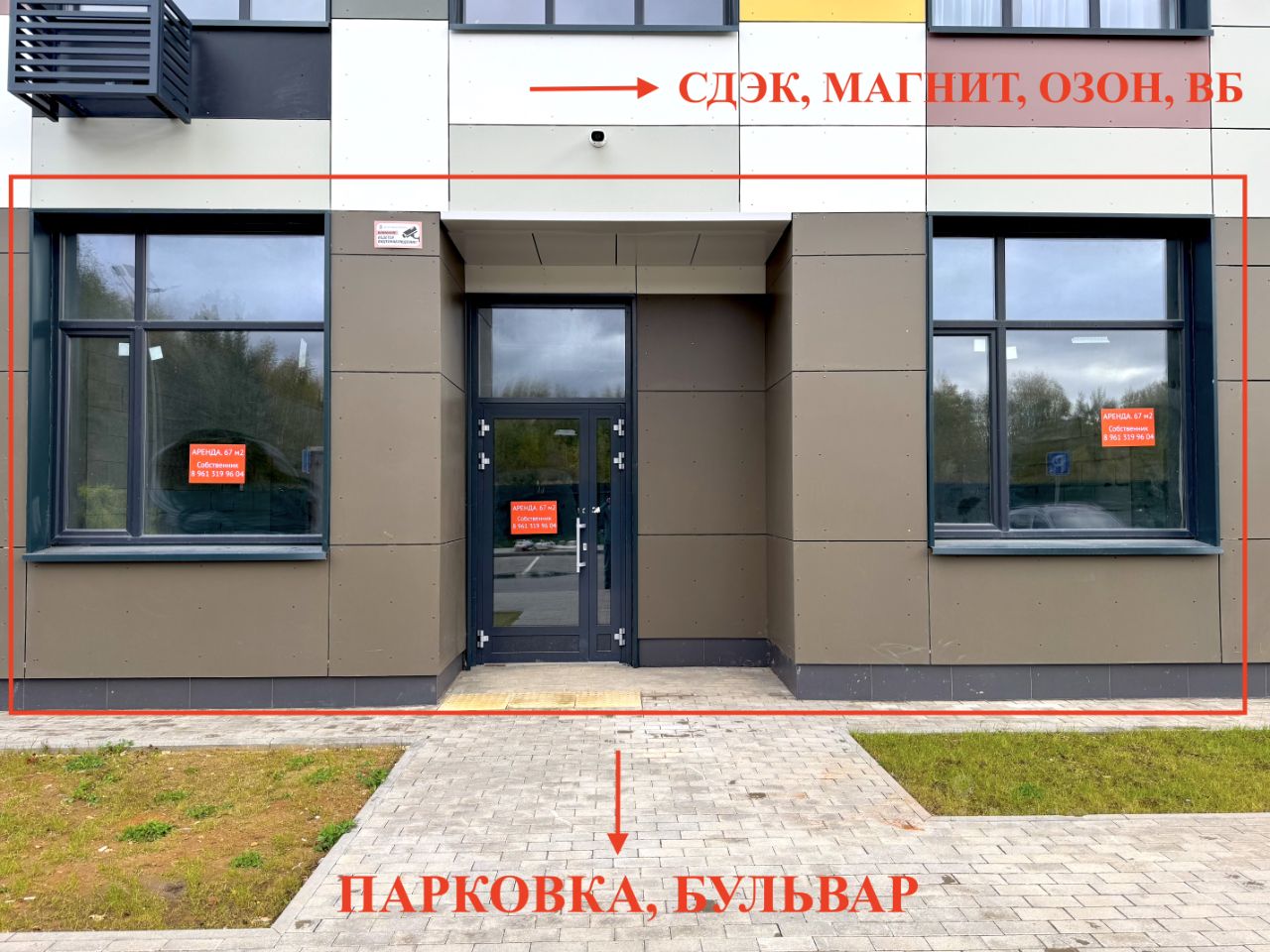 Помещение расположено в угловой части здания, 12 секция (не крайнее), выходит на большую парковку для жителей, и прогулочный бульвар. Возле помещения - выезд на объездную дорогу в Москву (ввод в эксплуатацию в 26 году).