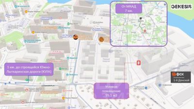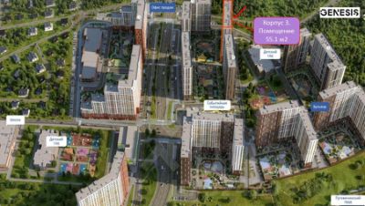 Угловое расположение на въезде в ЖК на первой линии домов с высоким пешеходным и автомобильным трафиком.