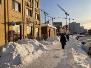 Интенсивный автомобильный и пешеходный трафик, вокруг плотная застройка.