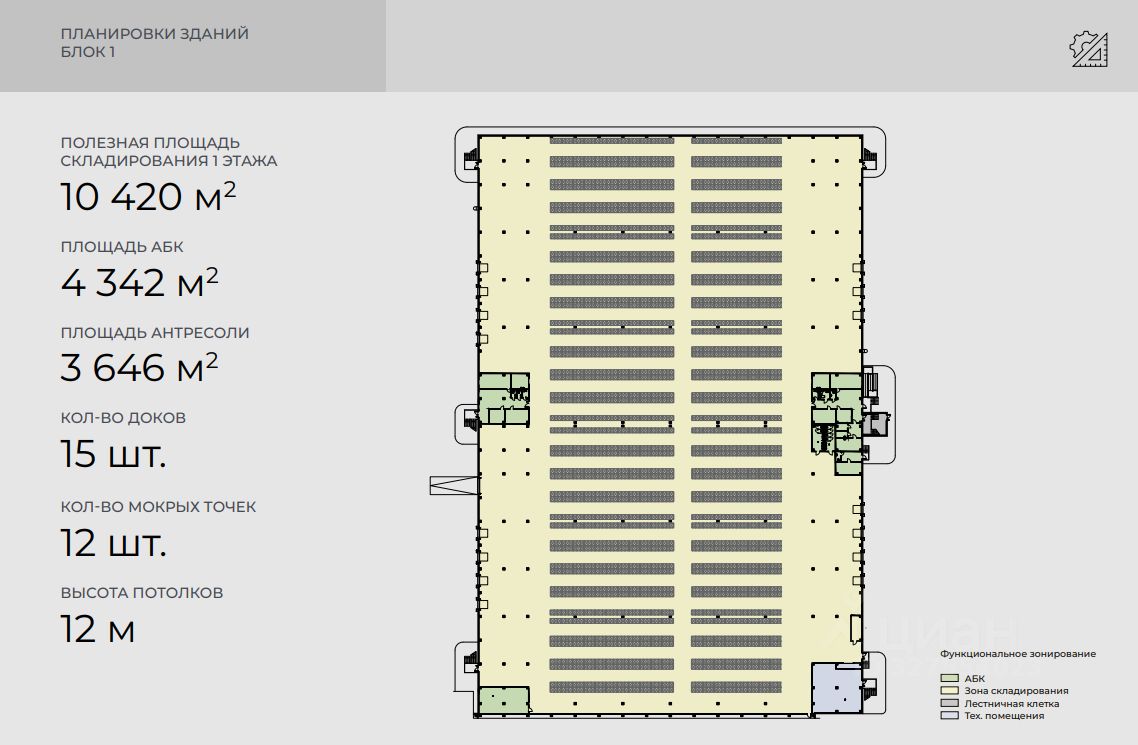 погрузочно-разгрузочной зоной по всей длине складского блока.