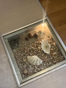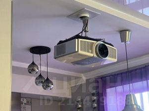 Кухня соединена с гостиной с диваном, шкафом, встроенным столом, проектором и экраном, из нее вход в гардероб с системой хранения, гостевой санузел и застекленный балкон.