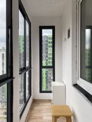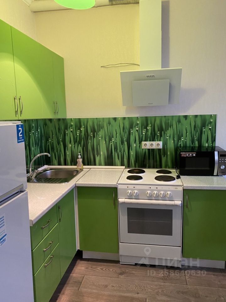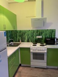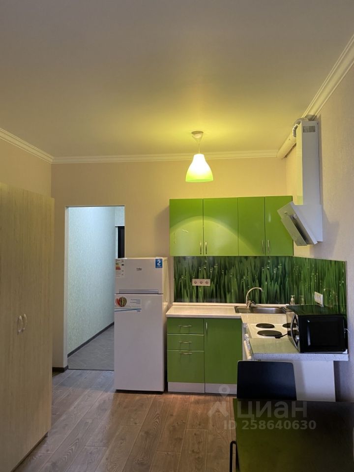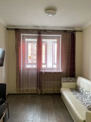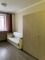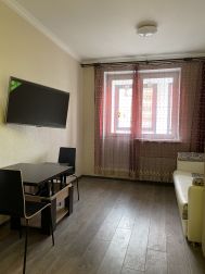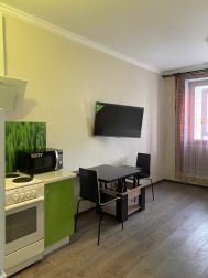 Уютная 1-комнатная квартира-студия с лоджией в новом доме. Отличный ремонт, полы ламинат и плитка, есть вся необходимая мебель и техника для комфортного проживания: электропечь с духовкой, холодильник, стиральная машина, телевизор, микроволновая печь, вытяжка, утюг. Окна выходят во двор.