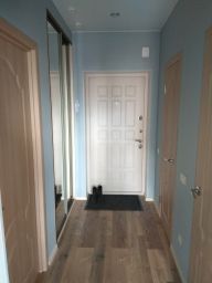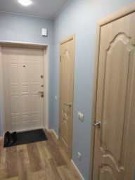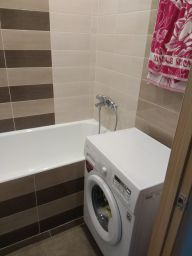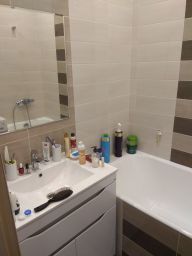 В квартире есть кондиционер, стиральная машина, плита, микроволновка, холодильник, телевизор. Из мебели встроенный шкаф в коридоре, кухонный гарнитур, стол со стульями, трехстворчатый шкаф, диван, который раскладывается. Сидеть на нем можно втроем, спать вдвоём. Мебель пустая, моих личных вещей в ней нет.