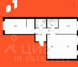 Квартира состоит из большой кухни-гостиной 32 м², двух изолированных комнат (12м² и 18м²), в 18 метровой комнате имеется помещение 3м² - его можно использовать под гардеробную или для иных целей, 2 раздельных оборудованных санузла, один из санузлов с ванной.