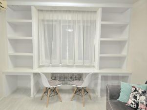 Кухня со встроенной мебелью и техникой. Широкая 80 см столешница из натурального дальневосточного дуба, стол круглый, раздвижной до овального, 4 стула. На лоджии дополнительная секция мебели, столешница и розетки для подключения рабочего места и мелкой бытовой техники.