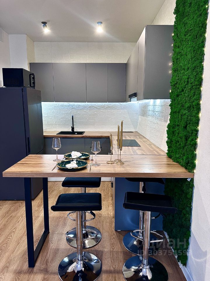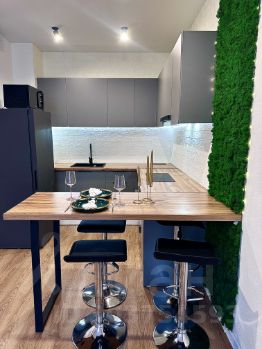 Современная техника встроена в удобное размещение мебели. Качественные материалы и элементы дизайна создают уют пространства. Удобный барный стол может использоваться многофункционально: и для приёма пищи, и для приёма гостей, и для работы на компьютере.
