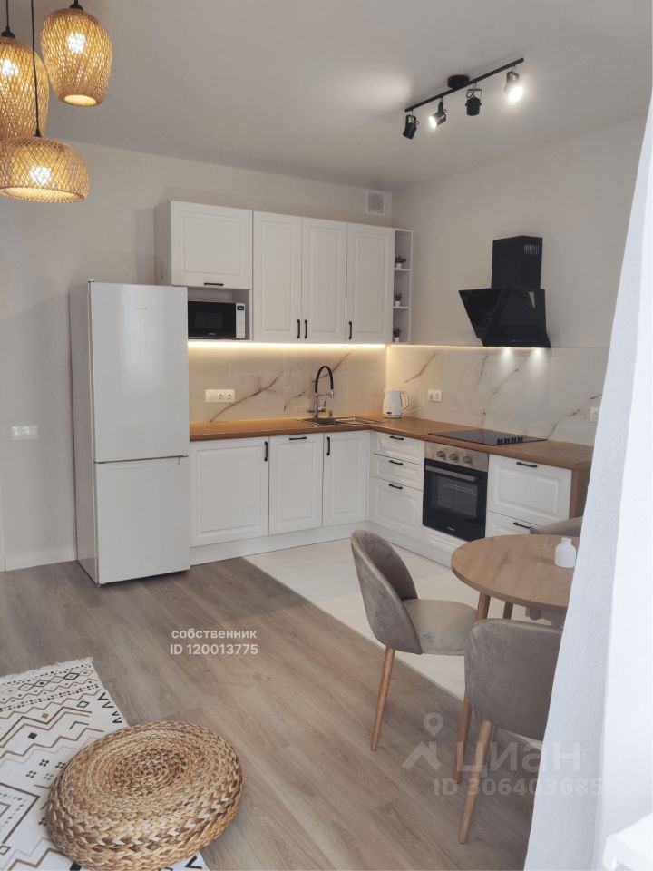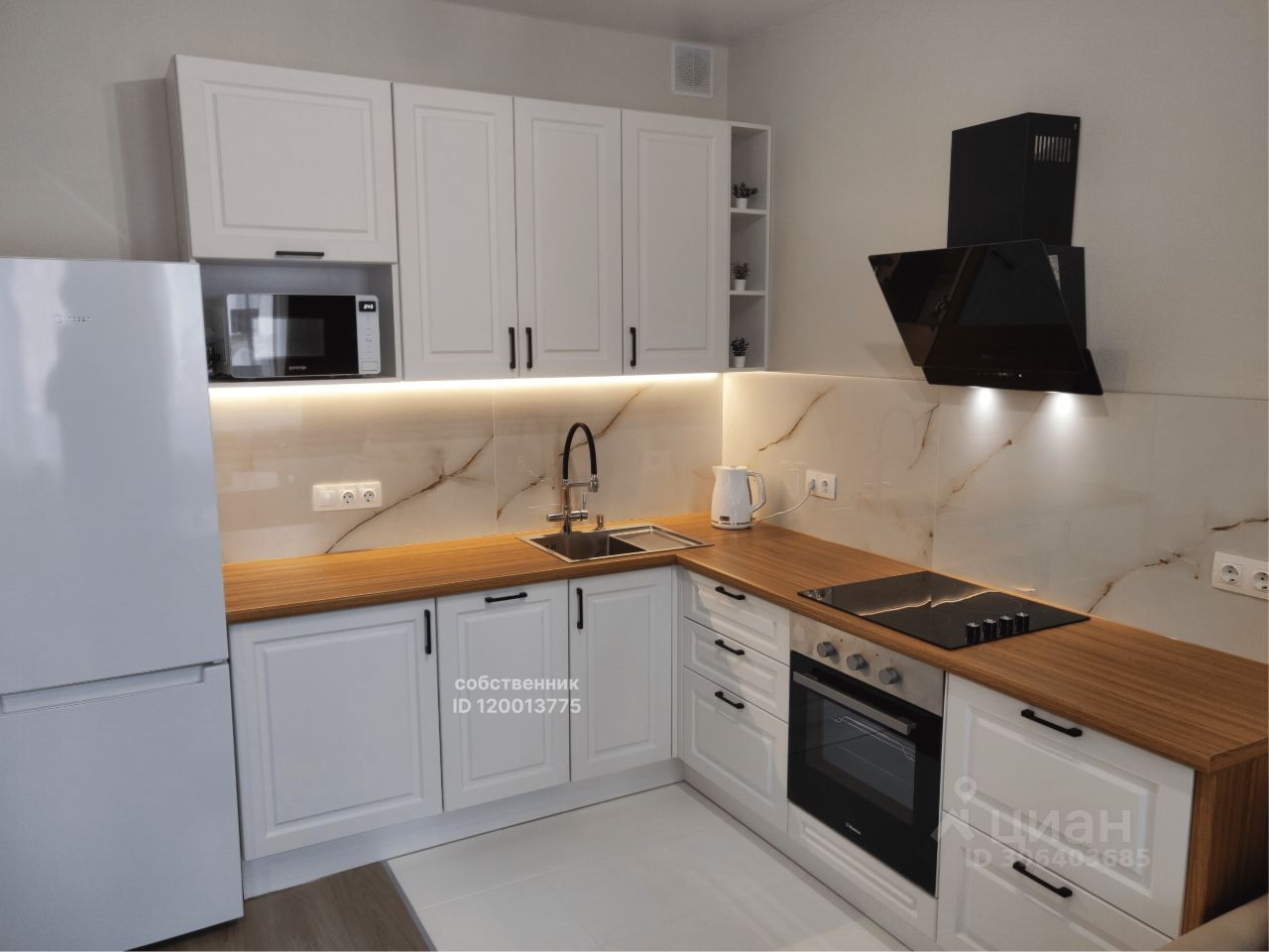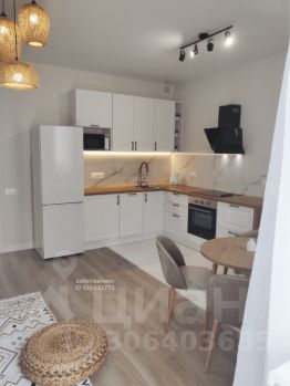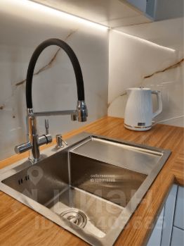 Полностью оборудована: духовой шкаф, плита, вытяжка, холодильник, посудомоечная машина на 45 см, микроволновка, чайник, фильтр для питьевой воды и дозатор для моющих средств. Продуманный и функциональный кухонный гарнитур.