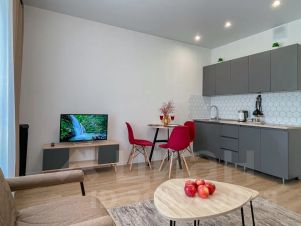 В кухонной зоне кухонный гарнитур с обеденной зоной, вся необходимая техника и посуда для приготовления и приёма пищи, телевизор с WI-FI, диван-кровать + раскладное кресло, шкаф и комод для хранения вещей.