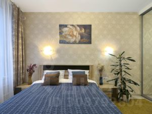Мебель: 2 кровати 2-х спальные с ортопедическим матрасом, зеркальный шкаф купе в комнате, диван в столовой раскладной, удобный, стенка, стол и стулья.