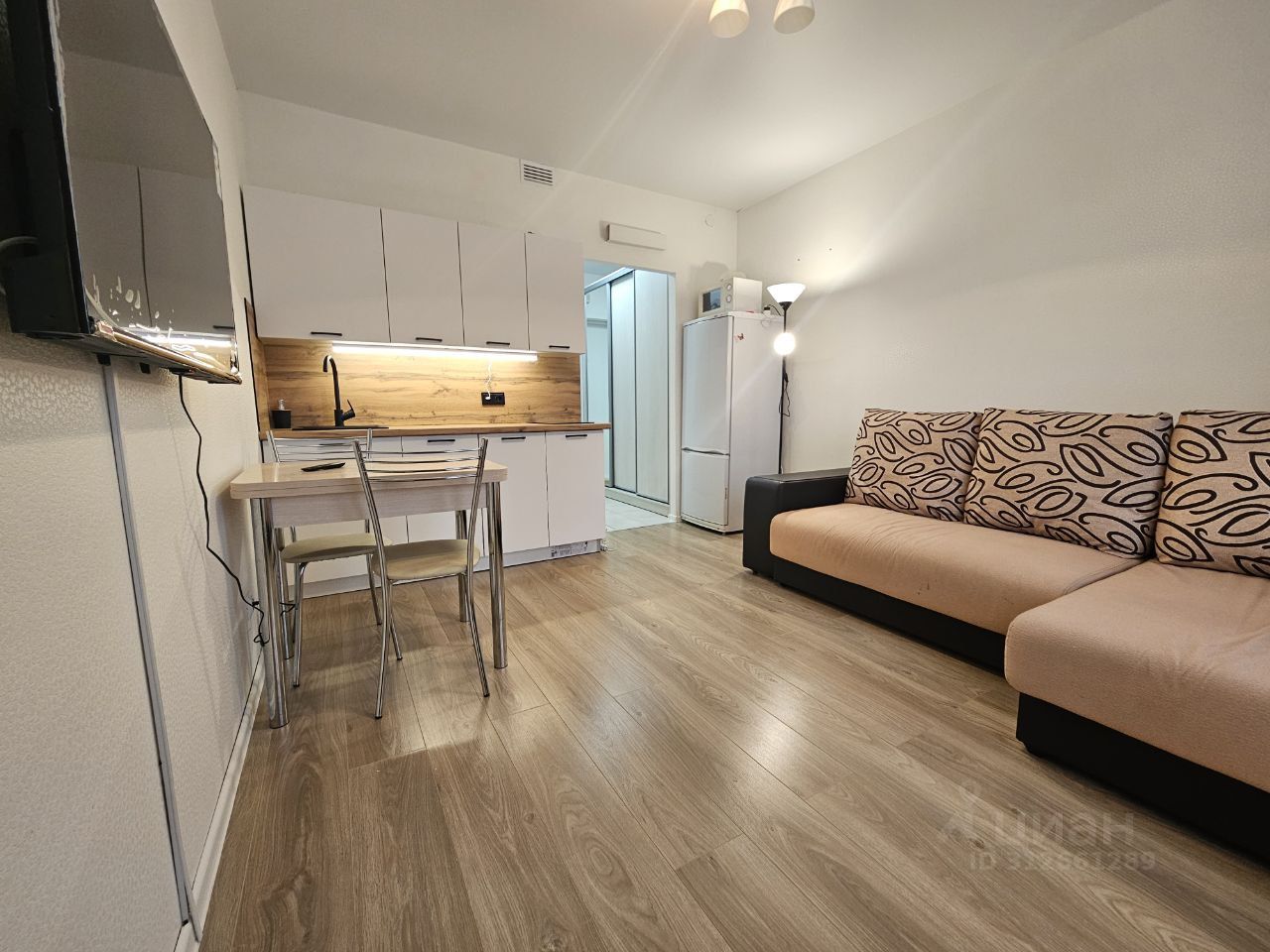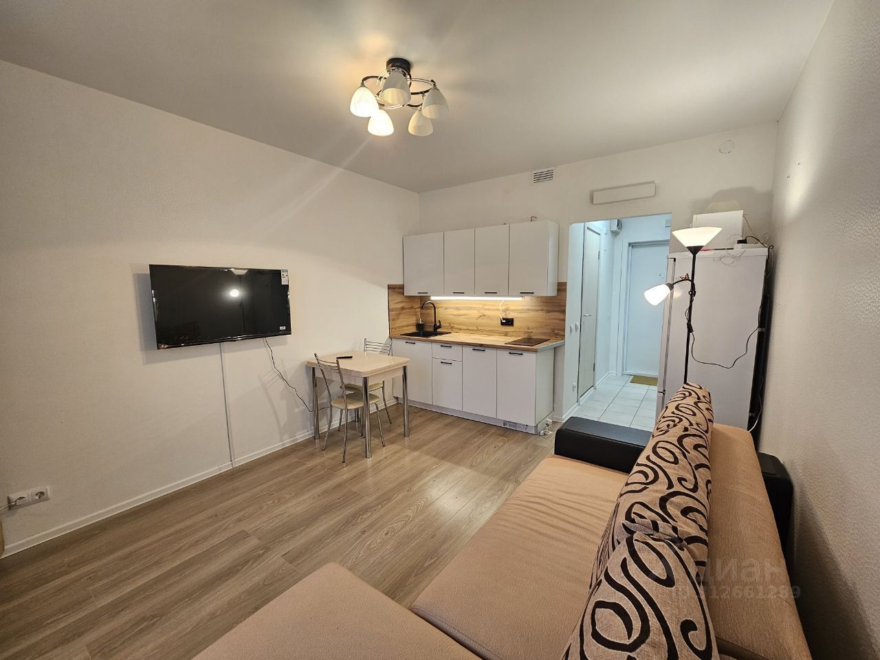 В комнате расположен новый кухонный гарнитур с варочной панелью, холодильник, микроволновая печь, телевизор, стол, стулья, также есть раскладной диван, на котором могут разместиться двое человек.