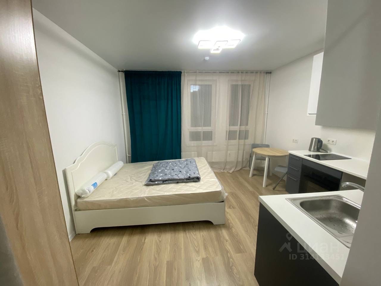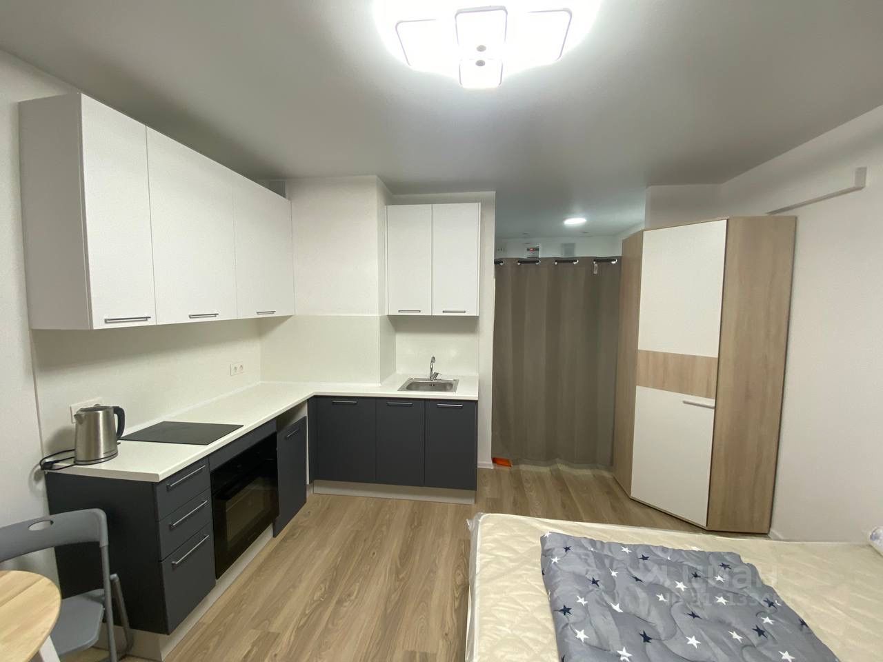 На настенных карнизах две шторы светлая со стороны стола и кухонного гарнитура; темная со стороны кровати для меньшего просвета.