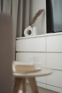 - Гостиная с удобным диваном, вместительным комодом и большим телевизором со SmartTV,