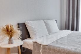 • Двуспальная кровать с ортопедическим матрасом застелена постельным бельем для 2-х гостей.