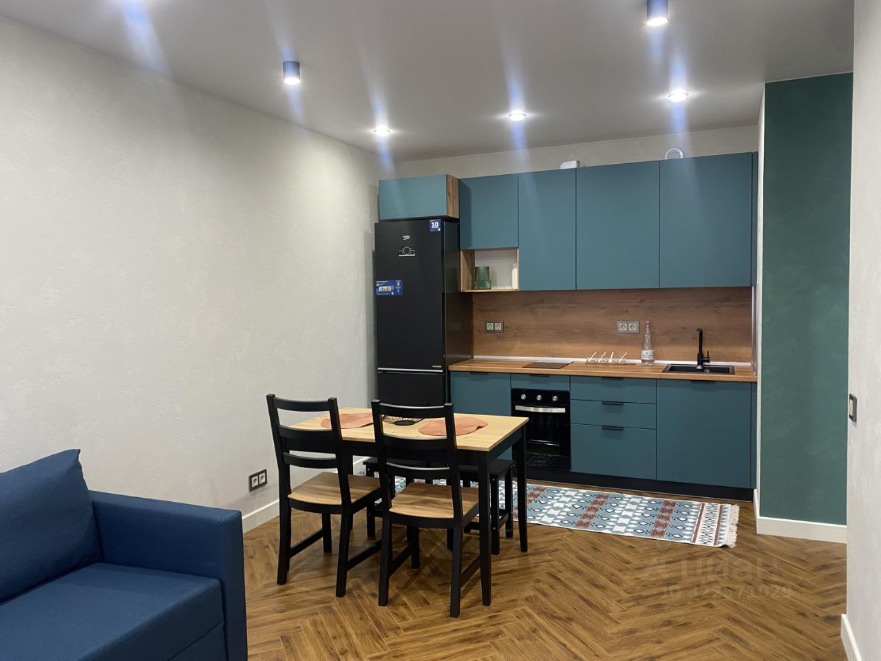 В гостнной-кухне большой раскладной диван, может использоваться как спальное место.