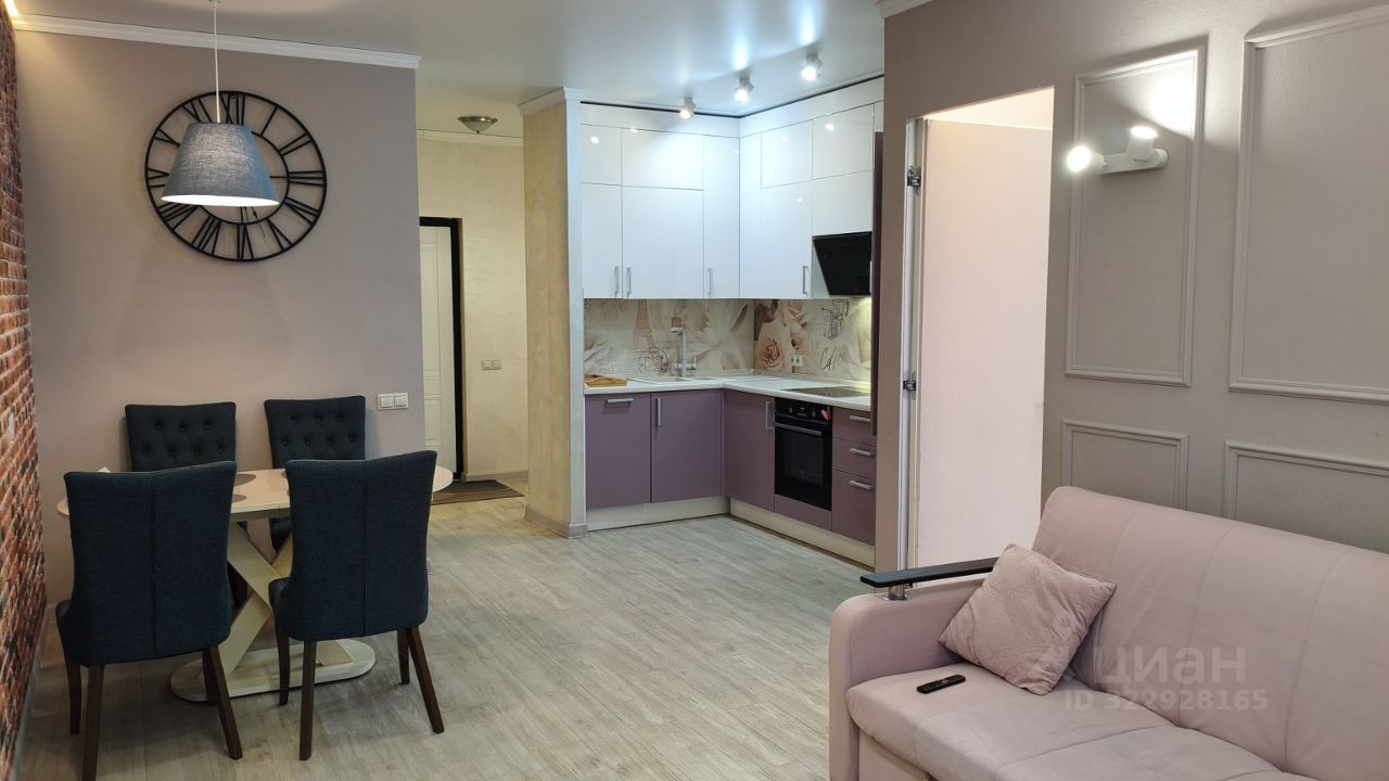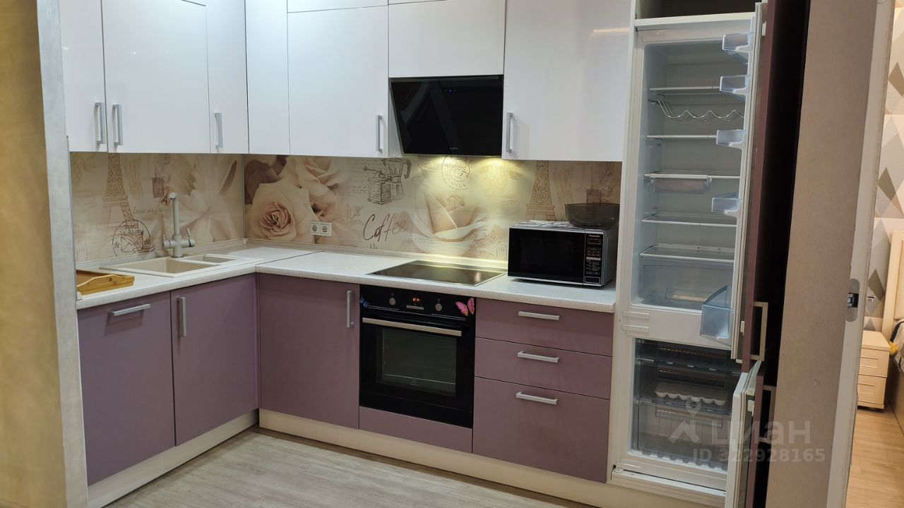 Просторная кухня-гостиная выполнена в нежных тонах пыльной розы. Кухонный гарнитур со встроенной бытовой техникой: посудомоечная машина, полноценная плита с духовым шкафом и варочной панелью, двухкамерный холодильник, микроволновая печь.