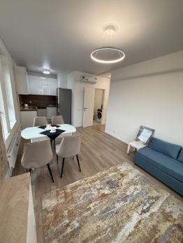 Квартира с евроремонтом, полностью готова для комфортного проживания. Здесь есть вся необходимая мебель в комнате и на кухне. В квартире также есть современная техника: кондиционер, холодильник, посудомоечная машина, телевизор и стиральная машина. Планировка квартиры включает совмещенный санузел с ванной. Окна выходят на улицу, что обеспечивает хорошее естественное освещение.