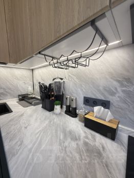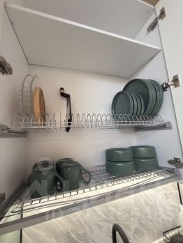 Полный набор посуды: кастрюли, сковородки, тарелки, чашки, вилки, ложки, ножи, разделочные доски и бокалы. Новый электрический чайники и даже робот-пылесос. Установлен кондиционер.