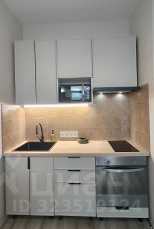 На кухне - духовка, варочная панель и микроволновка. Большой холодильник вынесен в коридор и не загромождает помещение.