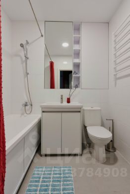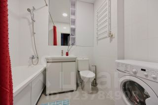 — Совмещённый санузел с современной сантехникой, стиральной машиной и местами хранения.