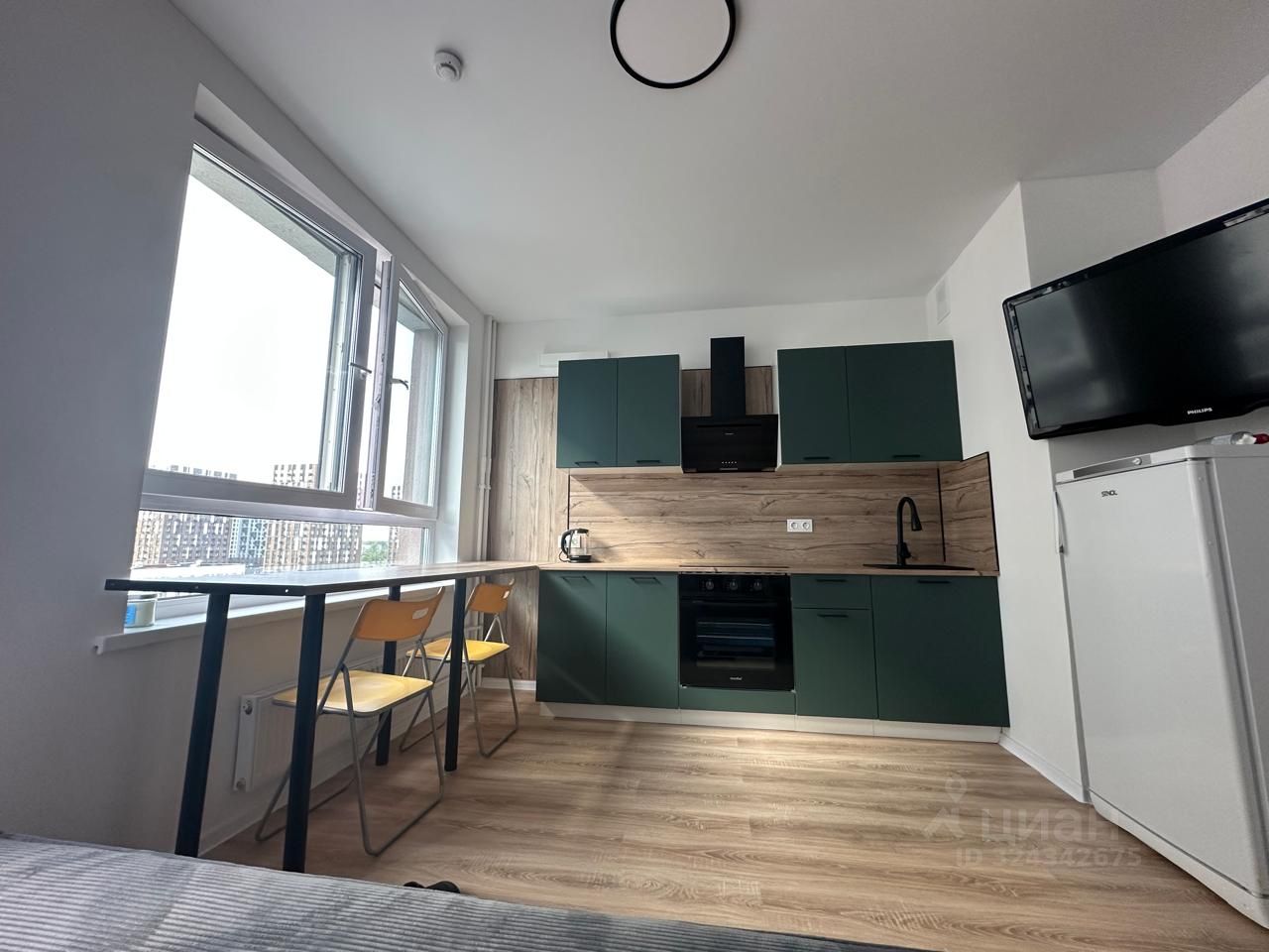 В квартире выполнен косметический ремонт. Просторная студия оформлена в светлых тонах и обставлена мебелью, которая создает атмосферу уюта. На компактной кухне есть вся необходимая техника: холодильник, посудомоечная машина и стиральная машина. В ванной комнате установлена современная душевая кабина. Также в квартире есть телевизор и доступ к интернету.