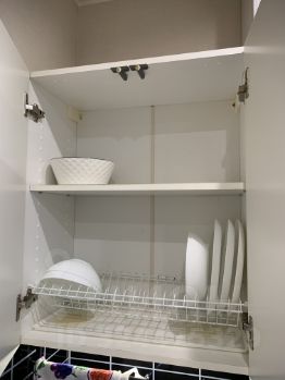 - кухня с выходом на балкон (кухонный гарнитур, электроплита с духовкой, СВЧ печь, холодильник, электрочайник, небольшая посудомоечная машина, диван двуспальный, телевизор, стол кухонный, стулья 4 шт., посуда, электровытяжка, диванчик на балконе);