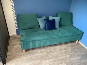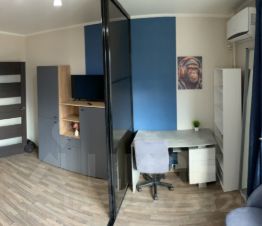 - комната разделена на две части стеклянными раздвижными дверьми (первая части комнаты: двуспальный диван, шкаф, телевизор; (вторая часть комнаты к окну: раздвижной полуторный диван, рабочее место.);