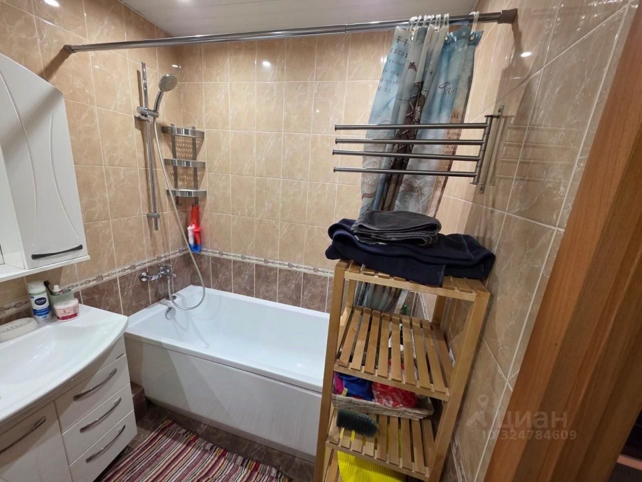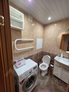 Санузел совмещенный, отделан плиткой, есть ванна с душем, раковина с тумбой, зеркало, стиральная машина и дополнительные полки и стеллажи для хранения. В прихожей установлены вешалка для верхней одежды, полка для обуви и шкаф, что делает входную зону функциональной и аккуратной.
