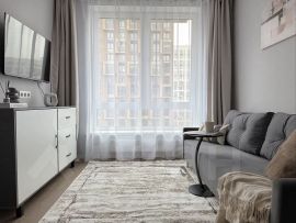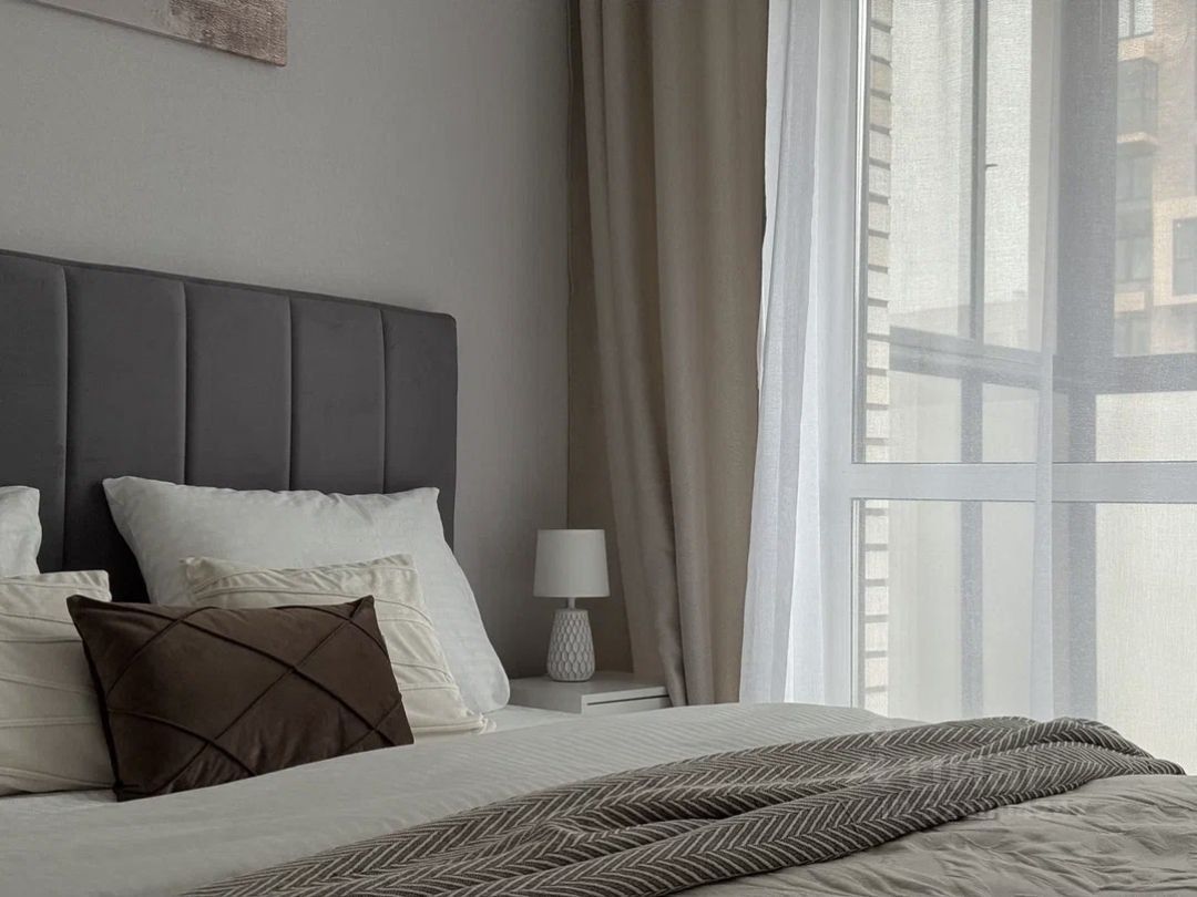 Интерьер квартиры выполнен по дизайнерскому проекту. В квартире есть всё необходимое для комфортного проживания: удобная мебель в комнатах, двуспальная кровать с отличным матрасом и подъемным механизмом, современная техника — кондиционер, холодильник, посудомоечная машина, стиральная машина и телевизор. Есть система очистки воды. Санузел совмещённый, с ванной. Окна выходят во двор, поэтому в квартире всегда светло и просторно.