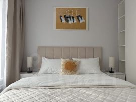 Интерьер квартиры выполнен по дизайнерскому проекту. В квартире есть всё необходимое для комфортного проживания: удобная мебель в комнатах, двуспальная кровать с отличным матрасом и подъемным механизмом, современная техника — кондиционер, холодильник, посудомоечная машина, стиральная машина и телевизор. Есть система очистки воды. Санузел совмещённый, с ванной. Окна выходят во двор, поэтому в квартире всегда светло и просторно.