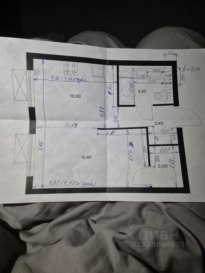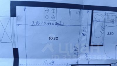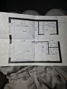 • Планировка: Кухня (10.3 м²) + комната (12.4 м²) + гардеробная (2 м²) + коридор (3.4 м²) + совмещённый санузел (3.5 м²).