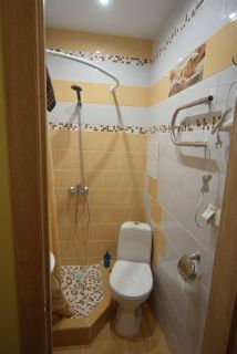 Встроенная кухня и отдельным санузлом. ТВ, кухонный блок со всей необходимой посудой. В ванной комнате - душ, туалет, раковина.
