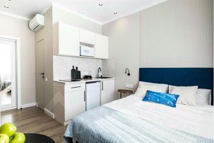 Уютная и светлая студия в новом жилом комплексе Римский Квартал. Интерьер выполнен в спокойных светлых тонах, всё выглядит аккуратно и современно. Отлично подойдёт для комфортного отдыха, командировки или короткого проживания.