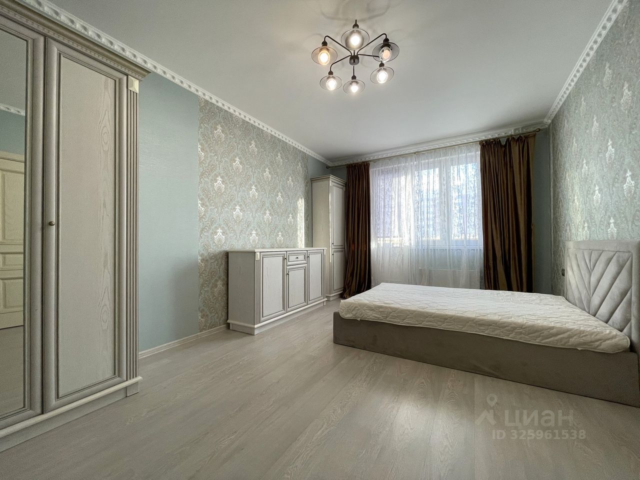 Мебель: двуспальная кровать, диван, трёхстворчатый шкаф с зеркалом, комод, в прихожей - шкаф для верхней одежды.