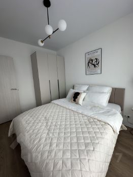 кухонный гарнитур со всей необходимой техникой: варочная панель, духовой шкаф, холодильник, посудомоечная машина; электрический чайник; посуда; два вместительных шкафа в прихожей и спальне, двуспальная кровать, раскладной диван, есть кондиционер и стиральная машина, а также телевизор со смарт ТВ и пр.