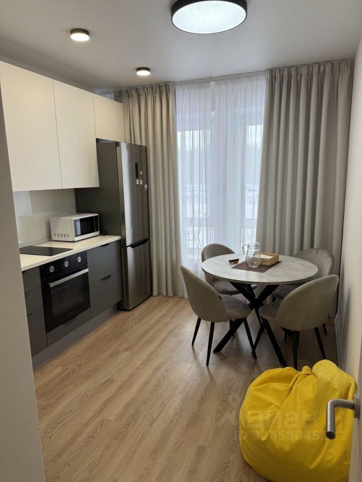 Квартира полностью меблирована: 2-спальная кровать 160 на 200, комод, кухонный гарнитур со всей бытовой техникой, стол, стулья, прихожая. На окнах шторы.
