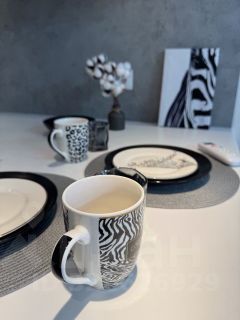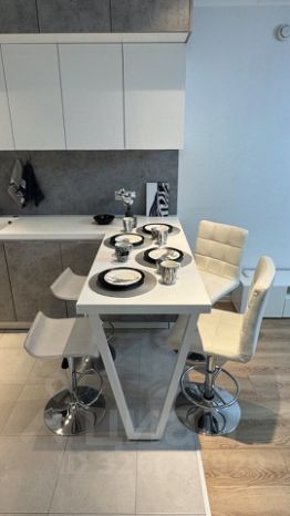 Кухонный гарнитур дополнен барным столом с четырьмя стульями. Во второй половине кухни-комнаты стоит большой раскладывающийся диван, напротив него-тумба под телевизор.