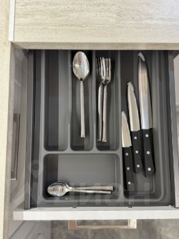 — кухонный гарнитур со встроенной техникой: СВЧ, холодильник, вытяжка