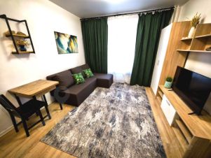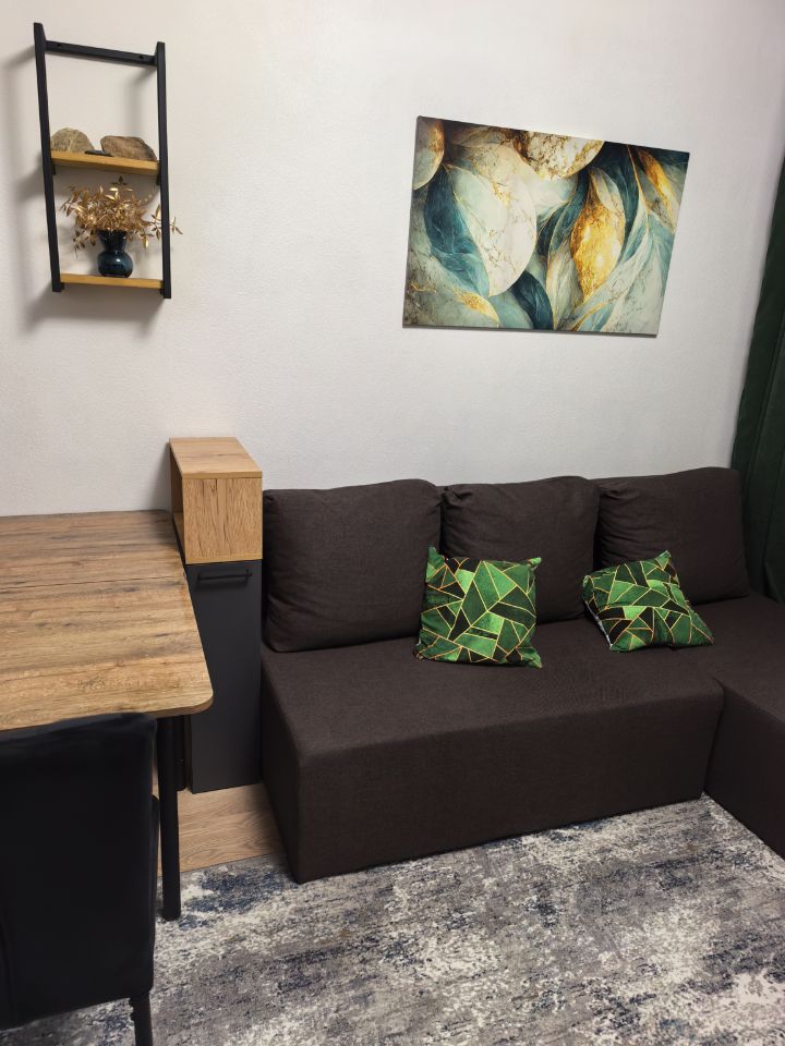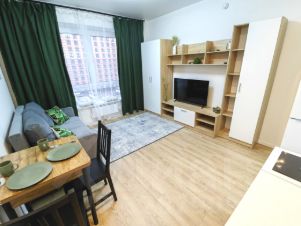 Имеется все необходимое: большое количество мест для хранения вещей (в стенке зала как на вешалке, так и отдельные полки для хранения),Гостиная оформлена в современном Лофт стиле, имеется- ТВ-стенка с телевизором 43" смарт ТВ с подключением в WI fi, раскладывающийся угловой диван с местом в большую кровать и местом для хранения белья, кухонный гарнитур с микроволновой печью, плитой, чайником и прочими удобствами кухни. Стол раскладывается, увеличиваясь в два раза. Шкафы позволят вместить на кухне все необходимое. Холодильник no frost не нуждается в разморозке. Полотенцесушитель электрический. Гладильная доска, утюг, сушилка для белья.