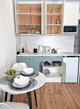Вся необходимая бытовая техника (стиральная машина, холодильник, фен, плазменный тв с выходом в интернет (смарт), утюг, микроволновая печь, чайник, кондиционер);
