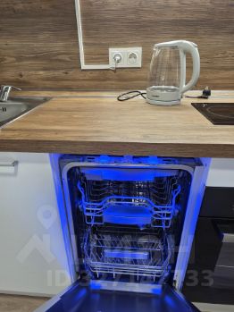 - Кухня-гостиная. Установлен кухонный гарнитур, диван для отдыха и ТВ-зона. Укомплектована: варочная панель, духовой шкаф, посудомоечная машина, холодильник, микроволновая печь, чайник, фильтры для воды.