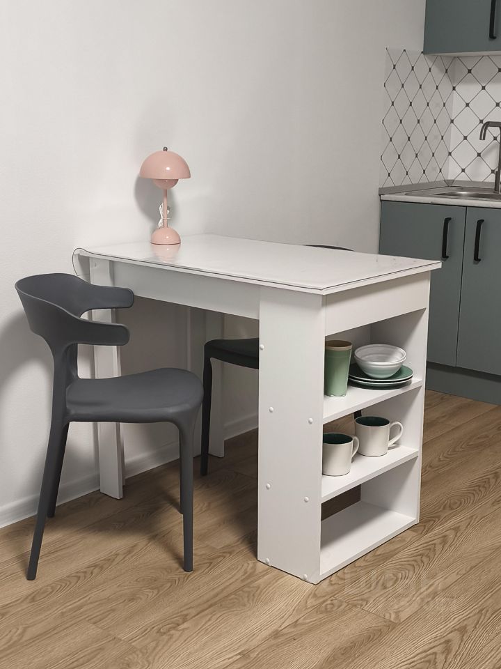 В квартире сделан косметический ремонт, есть мебель: раскладной диван, шкаф, прихожая, стол и кухня. Напротив дивана достаточно места, чтобы добавить что-то своё: если вам нужна детская кроватка или рабочее место с письменным столом или дополнительное место для хранения или кресло. Из техники: холодильник, плита, микроволновка и стиральная машина. Совмещённый санузел с душем.