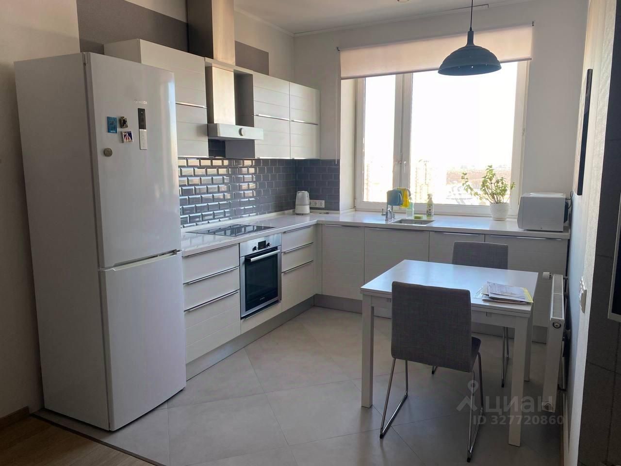 Кухня оснащена полным комплектом встроенной техники: варочная электрическая панель, духовой шкаф, воздухоочиститель, холодильник, посудомойка.