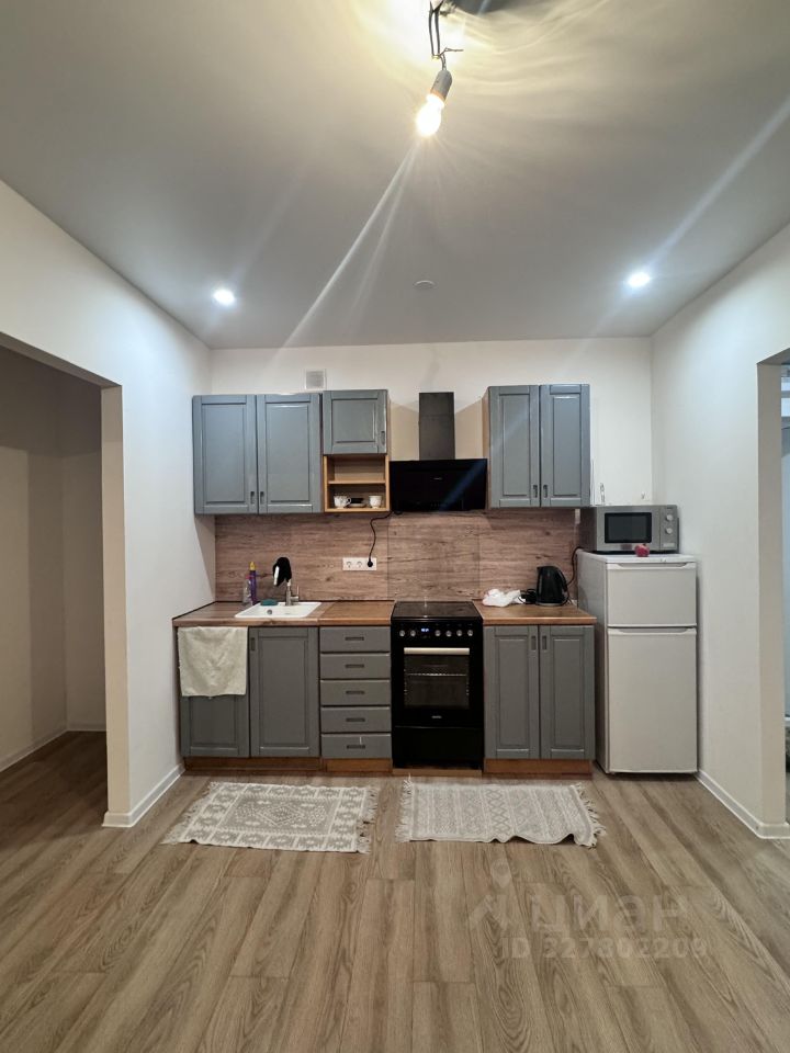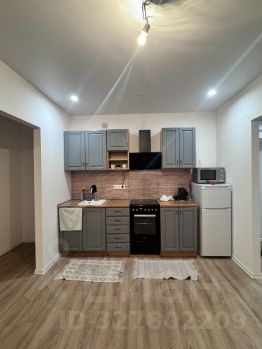 Кухня просторная, площадью 17 квадратных метров, оснащена необходимой бытовой техникой, включая холодильник и микроволновую печь, вытяжку.