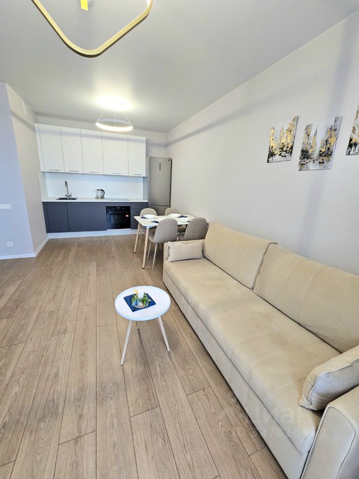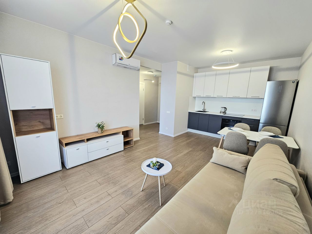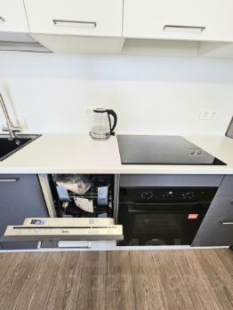 Кухня-гостиная: встроенный кухонный гарнитур, обеденная группа, посудомоечная машина и холодильник, варочная панель, вытяжка, духовой шкаф, удобный диван и модульная стенка, готовы приобрести ТВ, в случае необходимости, также установлен кондиционер.