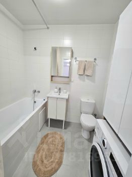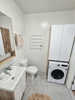 Санузел-ванна и стиральная машина, шкаф для хранения мелких принадлежностей.