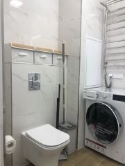 Санузел: душевая система с тропическим душем. Есть тёплый пол. Инверторная стирально-сушильная машина на 7 кг стирки и 4 кг сушки с паровым циклом и функцией управления через приложение. Электрический полотенцесушитель с регулятором нагрева и таймером. Зеркало с подсветкой и антизапотеванием.