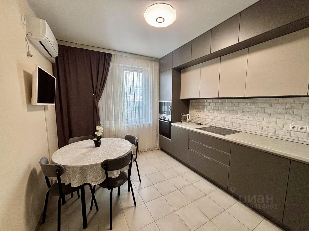 Из техники есть телевизоры на кухне и в спальне, холодильник, посудомоечная машина, встроенная микроволновая печь, духовой шкаф и варочная панель, кондиционер, стиральная машина. А так же есть пылесос и утюг. Всё есть для комфортной жизни. И из мебели необходимый набор так же обеспечен.