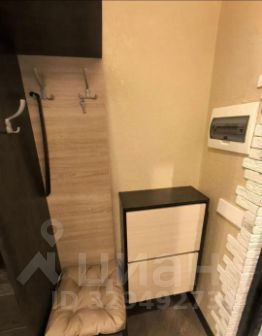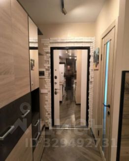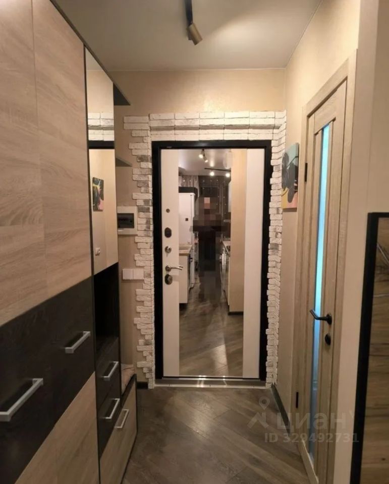 1.Прихожая с большим шкафом, зеркалом, пуфиком, отдельной вместительной обувницей и зеркальной входной дверью.